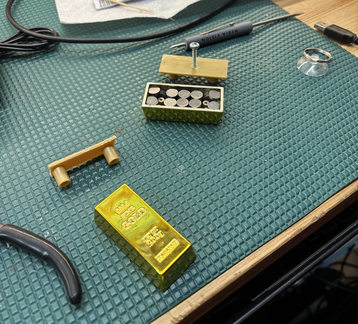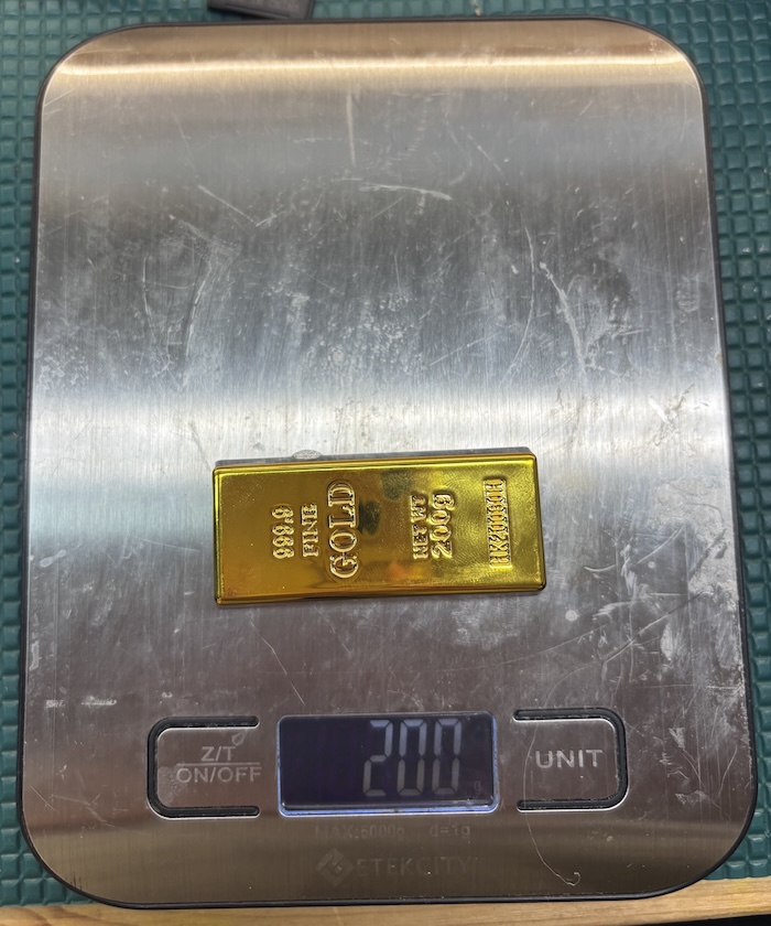Turns out Amazon sells fake gold bars that are not only stamped with roughly the amount of gold she and I bought, but cost way less. The downside is that they also weigh way less. But you know what doesn’t weigh less, and is also cheap? Tungsten, which Amazon also sells. We bought two different sets, opened the fake gold bar (the bottom pulls right out), super-glued the tungsten into it, and closed it back up.